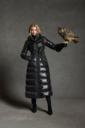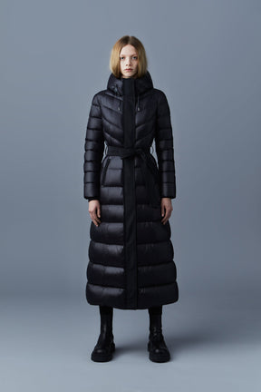 CALINA-R(칼리나 R)은 광택이 있는 리사이클 다운으로 제작된 롱코트입니다. 피팅되는 A라인 실루엣에 톤다운된 블랙 벨트와 대비를 이루는 쉐브론 퀼팅이 독특한 실루엣을 더욱 돋보이게 합니다. 조절 가능한 스톰 바이저 후드, 단열 포켓 및 리브 니트 커프가 맥카지만의 시그니처 기능을 제공합니다. 스톰 플래킷 마감으로 보호/보온 기능을 더합니다.