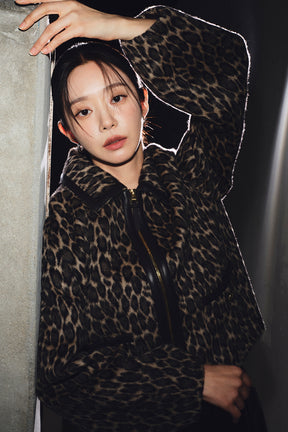 LORAH-A(로라-A)는 크롭 기장의 자카드 자켓으로, 돋보이는 애니멀 프린트가 특징입니다.
